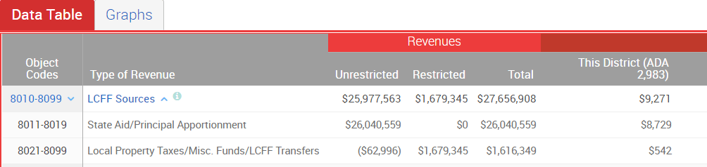 The State Aid amount ($8,729) is the base amount per student allocated to the district according to the Local Control Funding Formula. You can see a further breakdown by clicking on the object code (8011-8099):