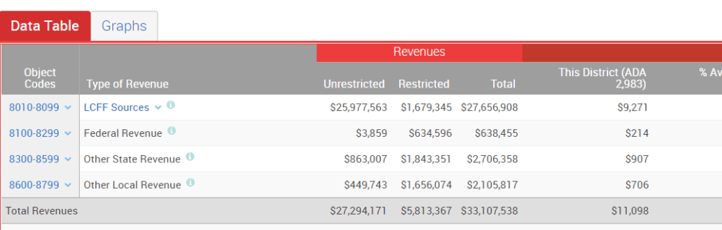 In order to understand how your local school district is funded, it’s helpful to look at a breakdown of different revenue sources. One the easiest tools for this is https://www.ed-data.org/
