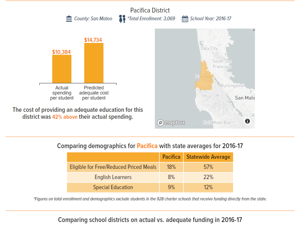 According to this tool, Pacifica School District would need to receive 42% more funding in order to provide an adequate education. Bear in mind that this web site is using data from 2016-17, and that the costs of education are probably even higher now.